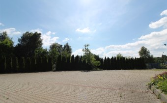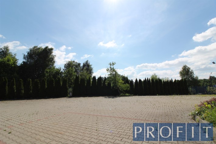 Działka wybrukowana kostką ok. 1500mkw, reszta tłuczniem. Działka jest ogrodzona. Budynek widoczny z głównej trasy DK 86 - bardzo duży ruch samochodowy.